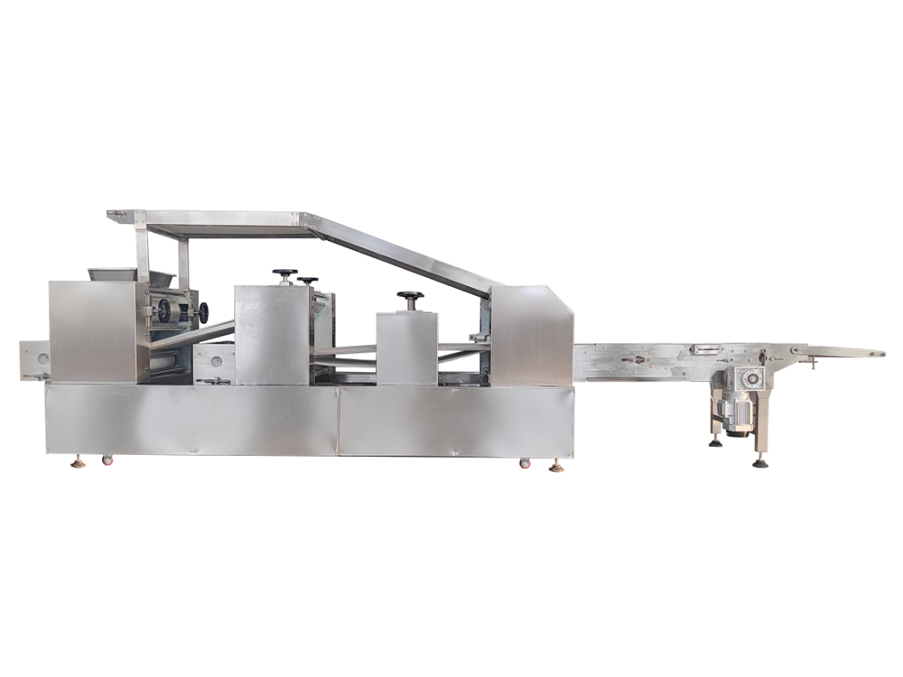 法餅成型機(jī)為臥式成型機(jī),通過傳送機(jī)構(gòu)將各道軋輥線速度比合理分配,實(shí)現(xiàn)從投料到制皮成型自動化生產(chǎn)。